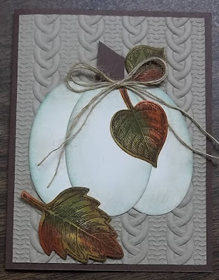 Using a die from the Layering Ovals Framelits I cut out 3 ovals from Pumpkin Pie cardstock and then embossed them with the Cable Knit embossing folder. I then sponged the edges with Soft Suede ink and then layered them together to create the pumpkin. From Soft Suede cardstock I hand cut a stem and used a die from the Cupcake Cutouts Framelits for the curly vine part.